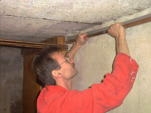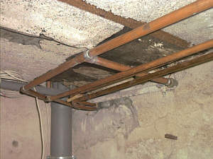 Die quer durch den Raum entlang der Decke verlegten Wasserleitungen müssen nun entfernt und entlang der Wände neu verlegt werden, um