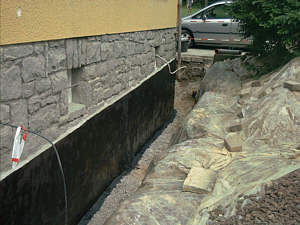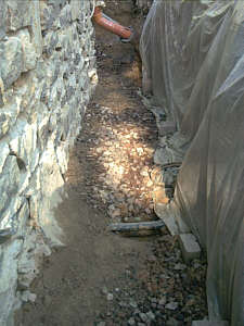 Nachdem die Drainagerohre verlegt waren, wurde die Baugrube mit Lavalit verfüllt
