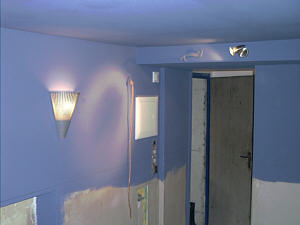 Der Anstrich der Wände erfolgt mit topasblauer Innenfarbe