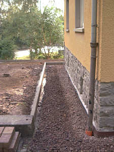 Nachdem die Drainagerohre verlegt waren, wurde die Baugrube mit Lavalit verfüllt
